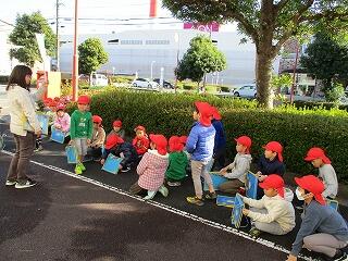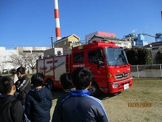 児童が運動場に避難した後、消防署の方々による消火のデモンストレーションを見学しました。
