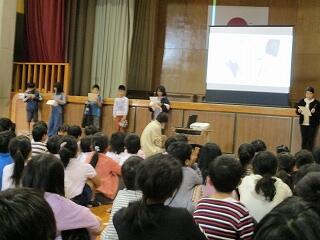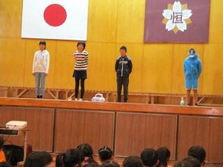 11月26日朝、体育館にて全校集会が行われました。今回は、生活安全委員会と保健委員会の発表がありました。