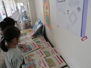秋山仁先生の本を手にとって見る児童や階段近くの壁に貼ってあるクイズに挑戦する児童など、興味関心が高まってきております。