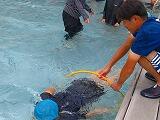2年生の水遊びの様子です。プールを周回する形で輪くぐりの練習をしていました。みんな上手に潜ったり浮いたりしてくぐっていました。