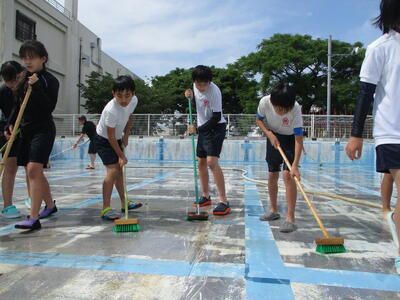 6月16日(木)、6年生がプール清掃をしました。6月末から、全校児童が気持ちよく水泳学習ができるよう、最高学年の子どもたちはデッキブラシを手に、プールの中やサイドを一生懸命に磨いてくれました。清掃をした午後は気温が高く、体に水がかかると子どもたちからは歓声があがっていました。