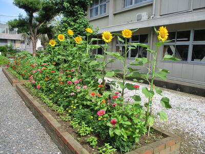 児玉英四郎先生は、恒富小学校の学校技術員さんです。学校の環境を美しく保つために、毎日暑い中でも草刈りや樹木の世話、傷んだ箇所の修理などをしてくださっています。花壇の花は、英四郎先生が種から育ててくださった苗を植えました。
