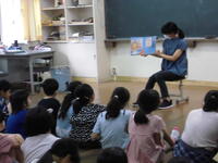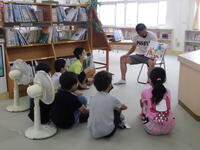 先生たちによる読み聞かせ会をしました。子どもたちには、事前に本の題名だけを伝え、自分が聴きたい本が読まれる部屋へ入ってもらいました。そこで初めて読み聞かせをする先生との対面。どの部屋でも熱心に本を見つめる子どもたちの姿が見られました。