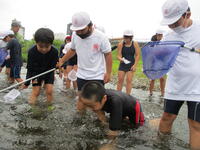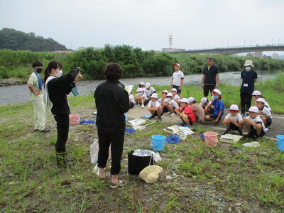 7月15日(金)、4年生が総合の学習で大瀬川へ行きました。自分たちが住む街を流れる川の環境を調べ、自然のよさを感じ自然を守っていく気持ちをもつことを目的とした学習です。市役所の生活環境課や薬剤師の方々が現地でいろんな体験をさせてくださいました。