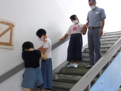 アイマスクをした児童は、一歩を踏み出すことも怖いようで、手助け役の友だちにしっかりつかまっていました。