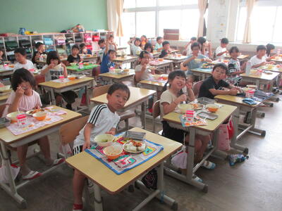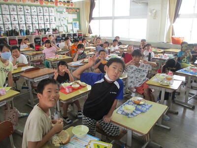 給食中の3年生!(無言で笑顔を送ってくれました)7/28