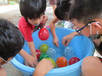 恒富小児童クラブから「ヨーヨーつり」活動のお誘いが職員室へありました。児童クラブへの渡り廊下へ行ってみると、たらいの水に浮かんだヨーヨーを子どもたちが真剣なまなざしでつり上げていました。そして、自分たちの手のひらよりも大きなヨーヨーを手にそれぞれに楽しんでいました。