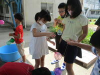 1年生が、アサガオの花で色水をつくっていました。毎朝水やりをして大切に育てて咲かせた花です。きれいな色水を見てとてもうれしそうな1年生でした。