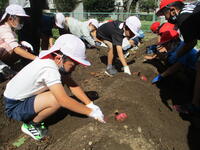 軍手をつけた2年生がおそるおそる土を掘ると、中から赤いサツマイモが次々と顔を出しました。