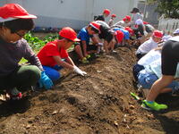 2年生が芋掘りをしました。6月、体育館裏の学習園に植えたサツマイモの蔓が学習園の外にまでのびていました。