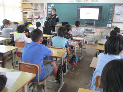 <租税教室(県北法人会延岡支部青年部会から)>税金とは何か、何に使われているかなどを児童目線で分かりやすく教えてくださいました。