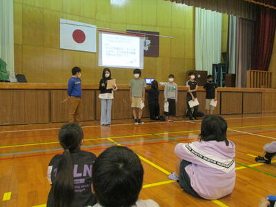 11月と12月の全校集会で、保健委員会、生活環境委員会、放送委員会が発表しました。どの委員会も伝えたいことをスクリーンに映しながら工夫して発表していました。