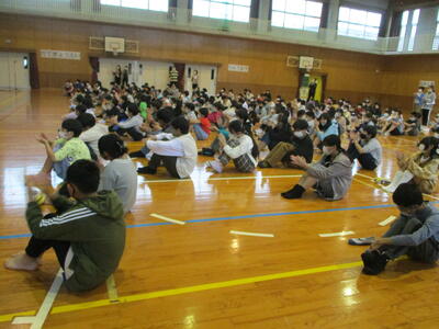 今回の避難訓練は「地震の後に津波が来る」という想定で行いました。避難場所は中校舎の3階で、各学年がそれぞれに決められた部屋に避難しました。合い言葉の「お(おさない)・か(かけない)・し(しゃべらない)・も(もどらない)・あ(あわてない)」を守って速やかに避難ができた子どもたちでした。