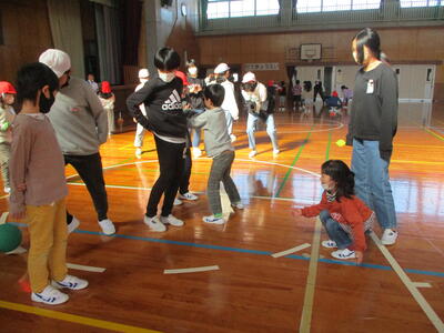 昼休みに、6年生と1年生が体育館で「転がしドッジボール」をしていました。これは、6年生の国語科学習の関連で、1年生に学校をもっと好きになってもらうことを目的として、6年生が企画・準備・運営をしたものだそうです。