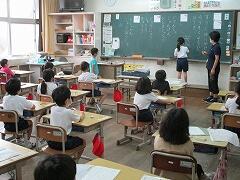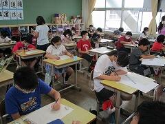 1年生は国語の授業、ノートのマスに、促音(「らっぱ」のようにつまる音)の表記に気を付けながら、正しく書く練習をしました。みんなマスからはみ出さないように、きれいに書いていました。