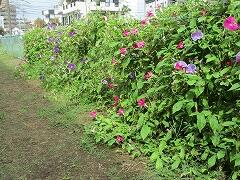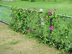 旧幼稚園の園庭の周りのフェンスに、様々な色の花を咲かせています。