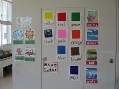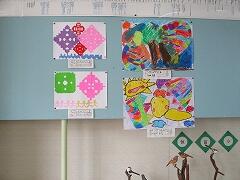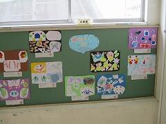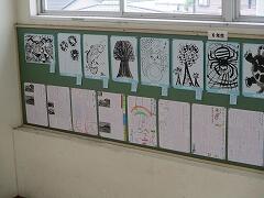 階段の踊り場や事務室前の掲示板に、子どもたちの作品が掲示されています。