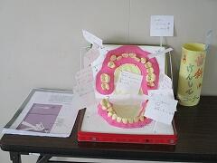 子どもたちは、自分たちの番が来るまで、ソーシャルディスタンスを保ちながら、廊下で待ちます。その保健室前の廊下には、学校歯科医の先生手作りの、歯形の模型も置かれ、子どもたちはその模型を見ながら、歯の健康について考えながら自分の検診の番を待ちました。