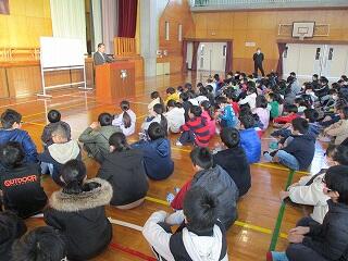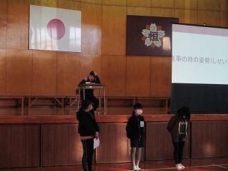 初めに校長先生のお話がありました。「現在の学年も残り2ヶ月。学習等のまとめの時期です。健康に留意しながら、一日一日を大切に生活していきましょう。」といったお話がありました。