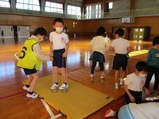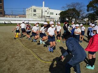 最後に、縦割り班に分かれて、学年の違う友だちと一緒にいろんな長縄のとび方をしながら楽しみました。