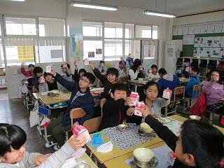 給食時間には、保健の先生の放送に合わせて、みんなで牛乳かんぱいをしました。