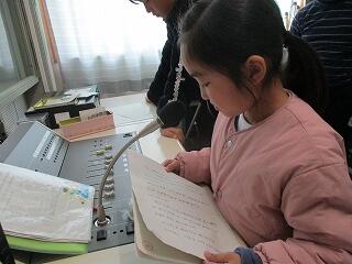 今回は、1年生の2人が、昔遊び体験の作文を発表してくれました。その発表に続けて、作文のよかった点を2年生2人が放送してくれました。