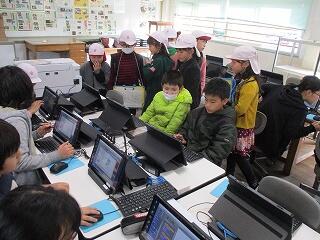 パソコン室では、6年生の部長さん・副部長さんのクラブ活動紹介の後、実際にパソコンでどのようなことをしているのか見せていきました。