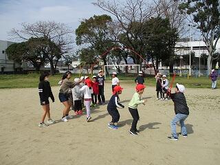 6つの班に分かれて、13もの遊びを、それぞれ一緒にしながら楽しみました。やり方が分からない保育園の年長さんに1年生が教えてあげる場面も見られ、1年生の成長を感じました。