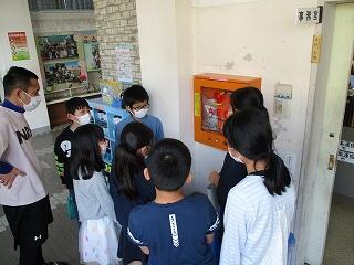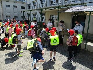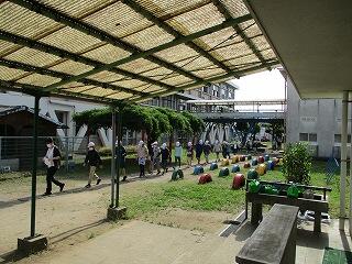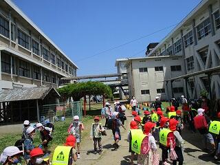 児童は学級担任の誘導で、教室から渡り廊下や階段、中庭を通り、「一次避難場所(運動場北門前)」まで、避難しました。
