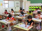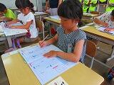 1年生の書写の時間です。入学当初は、筆圧の弱い字だったのが、しっかりとした筆圧で力強い字が書けるようになっています。また、とても丁寧に書いていました。よくがんばっています。