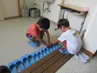 1年生が、トイレに入る前にスリッパ並べをしていました。誰かに言われるのではなく、自分から進んで行っていました。まさに「考動=幸動」です。素晴らしいです!