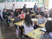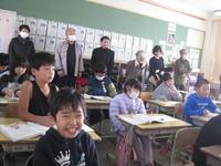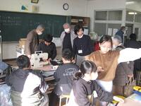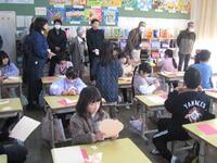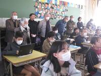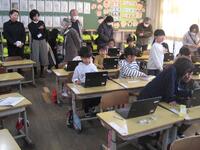 次に、各学級の授業の様子を参観していただきました。1年生は、タブレットで練習問題を解いている様子。2年生は、図工の学習の様子。3年生は、国語の様子。4年生は、外国語活動の様子。5年生は、家庭科でミシンでエプロンを作っている様子。6年生は、プログラミング学習の様子を参観していただきました。