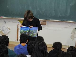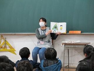今回は、1,2年教室で行われました。1年生は、目を輝かせて絵本を見つめお話に夢中になっていました。