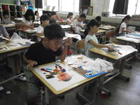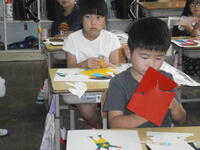 1年生の図工です。箱や袋を思い思いに飾り、きれいな入れ物を作る工作です。折り紙を切ったり貼ったり楽しそうでした。