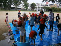 今日は、プールの機械の関係で水遊び(体育)の学習ができませんでしたが、生活科の時間に「夏の遊びをしよう!」を行っています。日差しはありませんが、むしむしする中の水遊びは気持ちよさそうです!歓声が沸き起こってます!