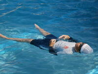 今日で水泳の学習がすべて終了となります。最後の5・6年生の学習は、着衣泳を行いました。服を着た状態で水の中に入ることで服の重さを感じたり、水の中での動きにくさを感じたりしていました。最後は、海や川で流されたときの合い言葉「浮いて待て!」を学習しました。ペットボトルや靴を使って浮く練習を行いました。