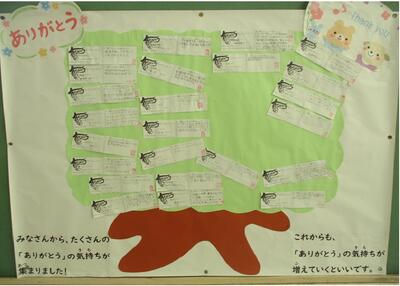 人権・同和教育担当の職員が人権についての話をしました。友達一人一人のよさを見つめ、それらの言動などに対する感謝の気持ちを表現した「サンキューカード」を「ありがとうの木」に貼る取り組みについて話をしました。感謝の気持ちがより一層広がっていくことを期待しています。