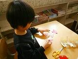 1年生図工「ちょきちょきかざり」折り紙を折りたたみ、切り取り模様を作成していました。
