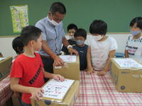 新しい教科書を教室へ運ぼう(左) 集まった夏休みの作品(右)