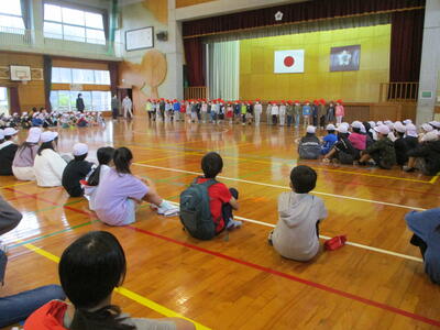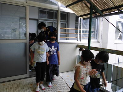 今回の避難訓練は「地震の後に津波が来る」という想定で行いました。避難場所は中校舎の3階で、各学年がそれぞれに決められた部屋に避難しました。合い言葉の「お(おさない)・か(かけない)・し(しゃべらない)・も(もどらない)・あ(あわてない)」を守って速やかに避難ができた子どもたちでした。