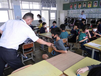 5月20日(金)に不審者対応についての学習を全学年で行いました。延岡警察署スクールサポーターの黒田さんが、「いかのおすし」の確認や「知らない人から、こんな声をかけられたらどうする?」を6年生代表児童と実演をしてくださったりしました。