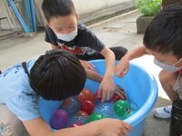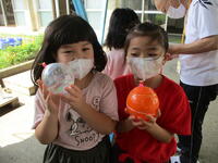 1年生が、アサガオの花で色水をつくっていました。毎朝水やりをして大切に育てて咲かせた花です。きれいな色水を見てとてもうれしそうな1年生でした。