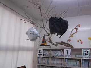 10月17日(水)、午後3時より読み聞かせの会「やまもも」の方々が来校され、約2時間かけて図書室装飾をしてくださいました。