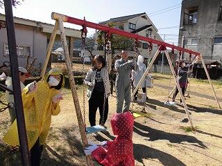 今回は、1~3年生が校舎の窓ふき、4年生が体育館の清掃、5,6年生がグリーンベルト(校内登下校道)やブランコへのペンキ塗りを行いました。