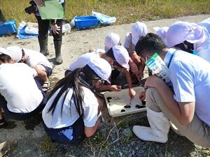 北川には、他地域では見られない豊かな自然が残っています。6年生は北川に残る動物や植物の説明を真剣に聞いていました。
