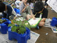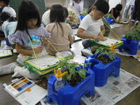 1年生がアサガオの観察をしていました。まいた種が芽を出し、葉っぱがたくさんになってきています。きれいな花が咲くのが楽しみですね!一生懸命に葉っぱを観察していました。