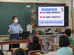 3時間目、延岡警察署少年係の方に来ていただき、5年生に向けて「非行防止教室」を実施しました。スマホや通信機能付きゲーム機などのインターネットによる危険性やトラブル、被害防止について学習しました。パワーポイント資料やDVDを観ながら、実際に起きている事案とともにわかりやすく説明していただきました。