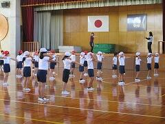 どちらの学年も、ステージの先生の動きを見ながら、一つ一つ、手足の動きや体の向きを注意しながら、練習に取り組んでいました。