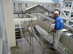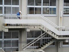 以前より気になっていた、南校舎の非常階段の緑のコケと汚れ。