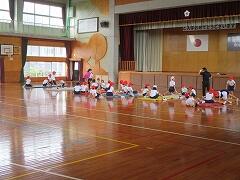 子どもたちの体育の授業、担任の先生と一緒に校長先生が指導しています。